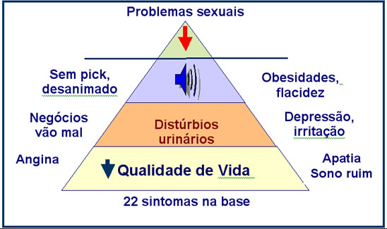 A Testosterona não atua apenas na parte sexual do homem, mas em todo seu corpo e seu metabolismo. A última coisa a aparecer na Andropausa é a impotência ou a diminuição da rigidez peniana. No quadro 1 vemos que quando um homem se queixa de impotência, ele já apresenta 22 outras alterações hormonais que infelizmente ele não percebe.