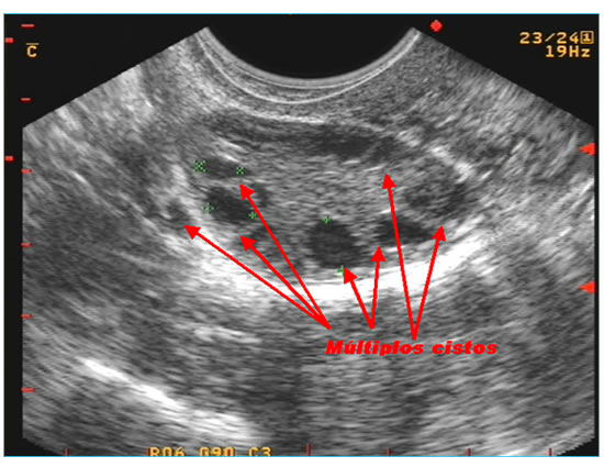 Cistos de ovários são óvulos em formação que não evoluíram durante sua transformação de células germinativas, para óvulos maduros. No quadro abaixo vemos inúmeros cistos em um ovário de uma garota de 17 anos