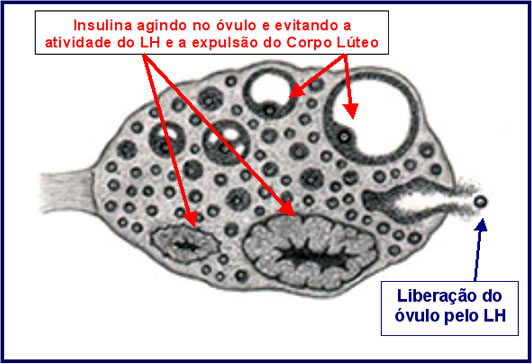 Caso a mulher apresente TENDENCIA AO DIABETES ou tenha sua INSULINA alta ela poderá alterar totalmente a fisiologia normal da ovulação. Sabemos hoje que a INSULINA é a verdadeira responsável pela formação do Cisto de Ovário, pois ela impede que o Hormônio Luteinizante libere o óvulo do corpo lúteo (Quadro 5). Com isso o óvulo não é eliminado do corpo lúteo e permanece preso no ovário.