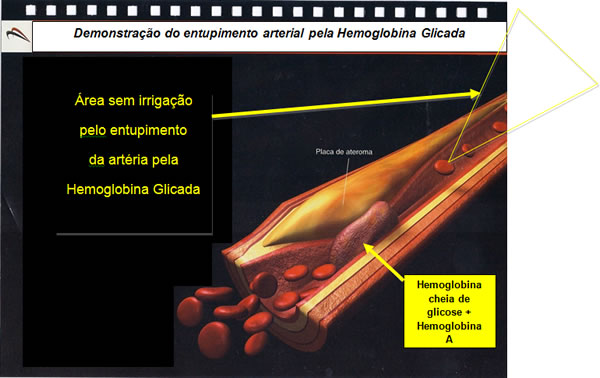 Quando o paciente tem muito açúcar no sangue este se liga a Hemoglobina A e se fica dentro da hemácia, causando um aumento na mesma e que irá entupir ou irritar todas as artérias do corpo.
