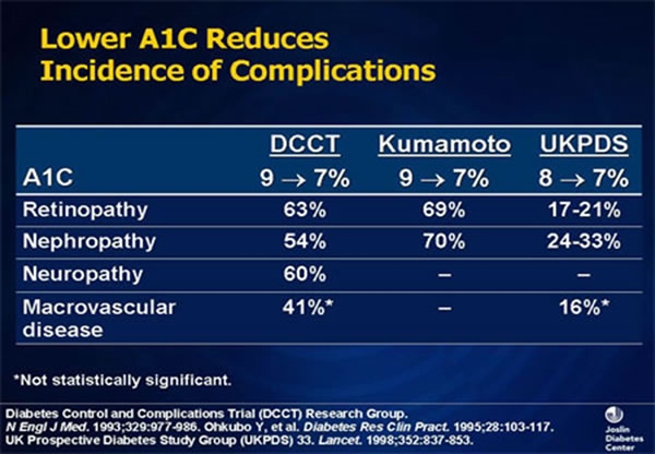 O nível da Hemoglobina Glicada (HbA1c) deve ser no máximo a 6% apenas pois acima desse valor já ocorre dano celular. Vejam no quadro abaixo quando diminuímos as complicações do Diabetes pela diminuição da HbA1c com medicamentos específicos